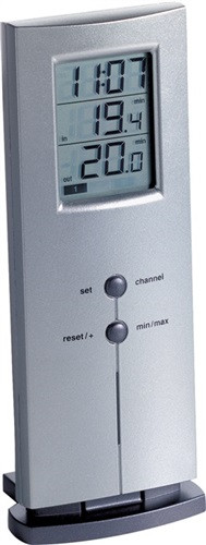 für innen · kabellose Übertragung der Außentemperatur über bis zu 3 Sender (max. 100 m Reichweite) · Max./Min.-Funktion · Uhrzeit · Messbereich außen: -40 °C bis +60 °C · Messbereich innen: -10 °C bis +60 °C · umschaltbar °C/°F · zum Hängen oder Stellen · inkl. 1 Temperatur-Außensender · Außensender H 127 x B 38 x T 18 mm · Weitere technische Eigenschaften Gewicht: 166g • Ausstattung: umstellbar Grad °C/Grad °F • geeignet für: innen • Material: Kunststoff