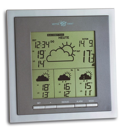 aktuelle Profi Wetterprognose Ihrer Region direkt auf Ihre Station · für 4 Tage im Voraus (heute und 3 Tage) · Vorhersage mit Symbolanzeige für alle 4 Tageszeiten (Vormittag, Nachmittag, Abend, Nacht) · mit Anzeige der voraussichtlichen Höchst- und Tiefstwerte für jeden Tag · Anzeige der Uhrzeit, Datum, Weckzeit und Innentemperatur · Außentemperatur über IT-Funktechnik bis 100 Meter