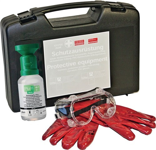 Inhalt: · 1 Paar Schutzhandschuhe (Gr. 8) trikotgefüttert aus PVC · Augenspülflasche 200 ml bei Verätzungsgefahr pH Neutral 200 ml gemäß DIN 15154-4 (40 00 386 418) · Schutzbrille dichtschließend, beschlagfrei, volltransparent mit Gummizug