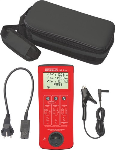 für sicherheitstechnische Prüfung von elektrischen Geräten/ Arbeitsmitteln, wie z. B. Elektrowerkzeuge, Motorgeräte, Leuchten, Verlängerungsleitungen, Haushaltsgeräte nach DIN VDE 0701/0702 DGUV Vorschrift 3 · einfache Bedienung über drei Tasten · die komplette Prüfung ist innerhalb von 10 Sekunden netzunabhängig durchführbar · automatischer Prüfablauf für Geräte der Klasse I, II (III) · Messung des Isolationswiderstandes, Schutzleiterwiderstandes, Schutzleiter- und Berührungsstromes nach Ersatzableitstromverfahren · Leitungstest inkl. RPE und RISO · Durchgangs- und Kurzschlussprüfung des Phasen-/ Neutralleiters · Spannung an externer Schutzkontaktsteckdose (L-N, L-PE, N-PE) · dreiphasige Prüflinge über optionale Messadapter prüfbar (Messadapter gehört nicht zum Lieferumfang) · Grenzwerte gemäß VDE-Norm voreingestellt Besondere Produktvorteile: Grafikdisplay, automatischer Prüfablauf mit gut/schlecht Aussage, Batteriekapazität für 2500 Prüflinge, kostenloser Download der Prüfprotokolle (Excel, PDF) unter www.benning.de