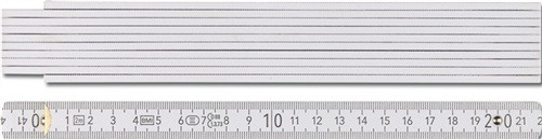aus Buchenholz · Gliederstärke 3,0 mm · Gliederhöhe 16 mm · ermüdungsfreie Federung mit innenliegenden Stahlfedern · mit Duplexteilung · Winkeleinteilung in der Gelenkverbindung des ersten Maßstabgliedes · 90°-Rastung · weiß lackiert · EG-Genauigkeitsklasse III · Weitere technische Eigenschaften Breite: 16mm • Gliederstärke: 3 mm • Gliederanzahl: 10 • Farbe: weiß • Teilung: mm/cm • Genauigkeit: EG III
