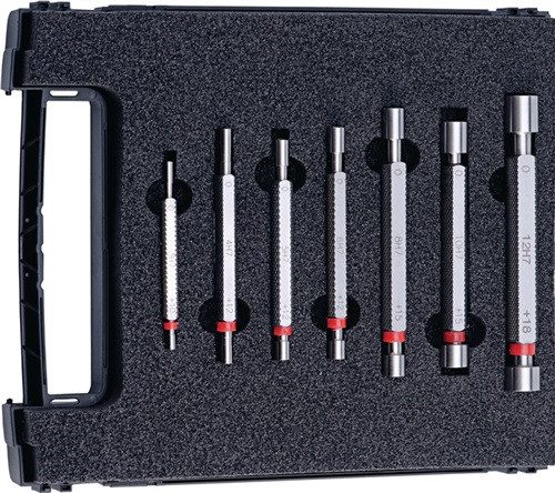 Baumaße nach DIN 2245 · mit Gut- und Ausschussseite · zur Prüfung von Bohrungen auf Maßhaltigkeit · Toleranzfeld H7 · Weitere technische Eigenschaften Inhalt: je 1 St. 3, 4, 5, 6, 8, 10, 12mm • Ausführung: mit Gut- und Ausschussseite