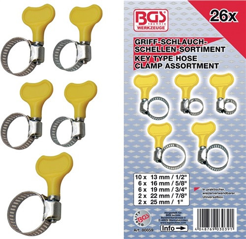 Schlauchklemme: Werkzeugstahl, gelbe Flügelmutter: Kunststoff · zur Werkzeugfreien Montage · beinhaltet die folgenden Größen: 10 Stk. für 13 mm bzw. 1/2" Schäuche 6 Stk für 16 mm bzw. 5/8" Schläuche 6 Stk. für 19 mm bzw. 3/4" Schläuche 2 Stk. für 22 mm bzw. 7/8" Schläuche 2 Stk. für 25 mm bzw. 1" Schläuche 26 tlg.