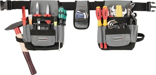 aus · grau-schwarz · beide Gürteltaschen mit je 5 Einsteckfächern · 1 Hammerhalter · 1 große Vortasche · 2 große Hauptfächer mit 3 Einsteckfächern · 1 separater Maßbandhalter · verstellbarer und herausnehmbarer Nylongürtel (1250 x 48 mm)