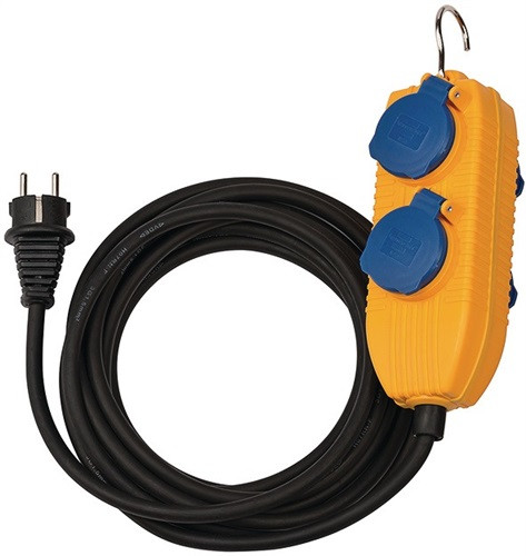 4 spritzwassergeschützte Schutzkontakt-Steckdosen mit selbstschließenden Deckeln · mit stabilem, einklappbarem Metallhaken · Gummikabel H07RN-F · zum ständigen Einsatz im Freien