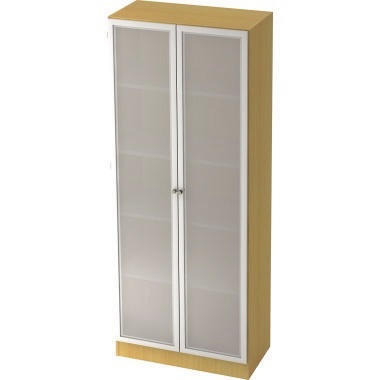 Glastürenschrank mit Drehtüren. Griffknauf. Höhenjustierbar durch den Boden 0-10 mm. Sockelblende 10 cm hoch. · Garantiedauer: 2 Jahre · Werkstoff der Front: Milchglas · Schließung vorhanden: Nein · Montageart bei Lieferung: zerlegt · max. Öffnungswinkel: 270 ° · Höhe des Fachbodenrasters: 32 mm · Werkstoff: Holz, melaminharzbeschichtet · Garantie gewährt: Ja · Farbe des Korpus: buche · Farbe der Front: silber/transparent · Anzahl der Ordnerhöhen: 5 Ordnerhöhen · Anzahl der Fachböden: 4 Fachböden · Maße: 80 x 200,4 x 42 cm (B x H x T)