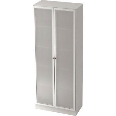 Glastürenschrank mit Drehtüren. Griffknauf. Höhenjustierbar durch den Boden 0-10 mm. Sockelblende 10 cm hoch. · Maße: 80 x 200,4 x 42 cm (B x H x T) · Werkstoff: Holz, melaminharzbeschichtet · Werkstoff der Front: Milchglas · Schließung vorhanden: Nein · Montageart bei Lieferung: zerlegt · Farbe der Front: silber/transparent · max. Öffnungswinkel: 270 ° · Garantiedauer: 2 Jahre · Farbe des Korpus: weiß · Garantie gewährt: Ja · Anzahl der Ordnerhöhen: 5 Ordnerhöhen · Anzahl der Fachböden: 4 Fachböden · Höhe des Fachbodenrasters: 32 mm