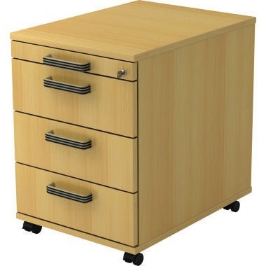 Zentralverriegelung. Streifengriff. Teleskop-Metall-Kugelführungen. Belastung Schub 25 kg. Container gleichschließend. Korpus verleimt, 2 mm Kunststoff -Kante gerundet. Rollen und Griffe müssen montiert werden. · Garantiedauer: 2 Jahre · Rollen vorhanden: Ja · Schließung vorhanden: Ja · Werkstoff: Holz, melaminharzbeschichtet · Material des Griffes: Kunststoff · Maße: 42,8 x 59 x 58 cm (B x H x T) · Farbe: buche · Auszugsperre vorhanden: Ja · Art des Auszuges: Teilauszug · Anzahl der Schubfächer: 4 Schubfächer · Anzahl der Auszüge pro Container: 4 Auszüge pro Container · Selbsteinzug möglich: Ja · Garantie gewährt: Ja