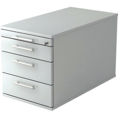 Zentralverriegelung. Relinggriff. Teleskop-Metall-Kugelführungen mit Selbsteinzug. Belastung Schub 25 kg. Container gleichschließend. Korpus verleimt, 2 mm Kunststoff -Kante gerundet. Stellfüße und Griff e müssen montiert werden. · Maße: 42,8 x 51,2 x 80 cm (B x H x T) · Werkstoff: Holz, melaminharzbeschichtet · Selbsteinzug möglich: Ja · Anzahl der Auszüge pro Container: 4 Auszüge pro Container · Schließung vorhanden: Ja · Rollen vorhanden: Ja · Material des Griffes: Kunststoff · Garantie gewährt: Ja · Farbe: grau · Auszugsperre vorhanden: Ja · Anzahl der Schubfächer: 4 Schubfächer · Garantiedauer: 2 Jahre · Art des Auszuges: Teilauszug