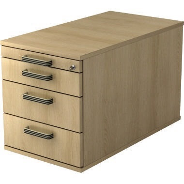 Orga-Schub. Auszugssperre wechselseitig. Teleskop-Metall-Kugelführungen. Schübe 25 kg belastabar. Container gleichschließend. Korpus verleimt. Kunststoff-Kante (2 mm) gerundet. Rollen und Griffe müssen montiert werden.