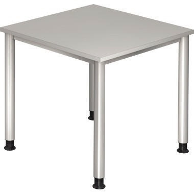 Sutfenlos einstellbar. · Höheneinstellbarkeit möglich: Ja · höhenverstellbar: Ja · Verkettbarkeit möglich: Ja · Oberflächenbeschaffenheit der Plattenoberfläche: melaminharzbeschichtet · Material der Plattenkante: ABS · Maße: 80 x 68-76 x 80 cm (B x H x T) · Art der Höhenverstellung: mit Kurbelantrieb · Form der Platte: Rechteck · Material der Platte: Holz · Farbe des Gestells: silber · Farbe der Tischplatte: grau · Dicke der Platte: 2,5 cm · Form des Gestells: 4-Fuß