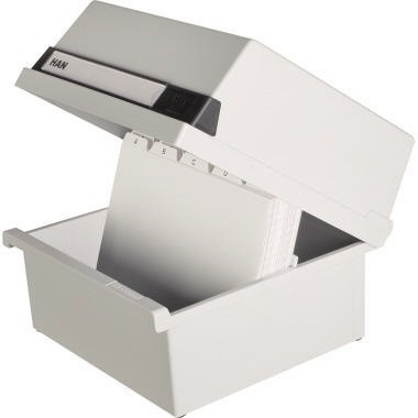 Das Unterteil kann platzsparend in den abnehmbaren Deckel gestellt werden, optimales Beschriftungsfeld, möbelschonende Kautschukfüßchen, verschiebbare Sichtreiter. · Farbe: lichtgrau · Verwendung für Kartenformat: DIN A5 quer · Tiefe: 250 mm · max. Anzahl der Karten: 800 Karten · Werkstoff: Polystyrol · Farbe des Deckels: lichtgrau · Breite: 235 mm · Ausführung der Lieferzusammenstellung: Inkl. verschiebbarem Sichtreiter, Gummifüßen, Beschriftungsf · Anzahl der Stützplatten: 1 Stützplatte · Maße: 23,4 x 18 x 24,8 cm (B x H x T) · Höhe: 190 mm