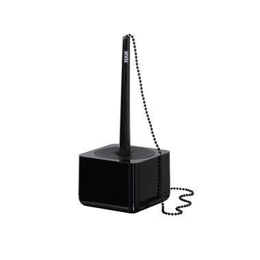 Ein elegantes, formschönes Accessoire für Büro und Empfang. Stilvoll und hochglänzend für moderne Schreibtischwelten. Rutschfest und möbelschonend durch großflächige, weiche Gummibeschichtung, Kugelschreiber an einer robusten Metallkette. · dokumentenecht: Ja · Werkstoff: Kunststoff · Tiefe: 65 mm · Schreibfarbe: schwarz · Material der Anbindung: Metall · Maße: 6,5 x 16 x 6,5 cm (B x H x T) · Länge der Anbindung: 68 cm · Farbe: schwarz/schwarz · Breite: 65 mm · Anzahl der Stifthalterungen: 1 Stifthalterung · Anbindung für Stift vorhanden: Ja · Höhe: 153 mm