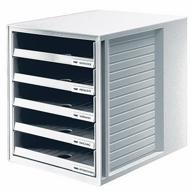 Schrank-Set. Außenhöhe und -tiefe sind abgestimmt auf Ordnerhöhe bzw. auf ein Ordnerfach im Büroschrank. Möbelschonende Gummifüßchen. · Griffloch vorhanden: Ja · Höhe der Schublade: 45 mm · Höhe: 320 mm · Maße: 27,5 x 32 x 33 cm (B x H x T) · rutschfest: Ja · stapelbar: Ja · Verwendung für Papierformat: DIN A4 · Gehäusefarbe: lichtgrau · Werkstoff: Polystyrol · Tiefe: 330 mm · Farbe: lichtgrau · Farbe der Schublade: lichtgrau · Breite: 275 mm · Beschriftungsfeld vorhanden: Ja · Auszugsperre vorhanden: Ja · Ausführung des Öffnungszustandes: offen · Ausführung der Lieferzusammenstellung: inkl. Gummifüßchen · Anzahl der Schubfächer: 5 Schubfächer · Format der Schubladen: 5 x breit · Griffmulde vorhanden: Nein