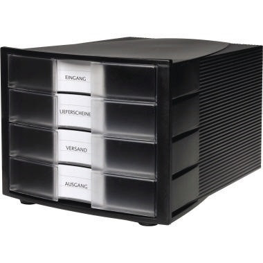 Groß dimensionierte, elegant integrierte Beschriftungsetiketten. Extra stabiles Gehäuse aus einem Stück gefertigt. Stapelbar, dadurch Platz sparend. Rutschfeste, möbelschonende Gummifüße sorgen für einen sicheren Stand. · Griffmulde vorhanden: Ja · Höhe der Schublade: 37 mm · Höhe: 235 mm · rutschfest: Ja · Tiefe: 368 mm · Verwendung für Papierformat: DIN A4, DIN C4 · Werkstoff: Polystyrol · Griffloch vorhanden: Nein · Maße: 29,4 x 23,5 x 36,8 cm (B x H x T) · Ausführung des Öffnungszustandes: geschlossen · Ausführung der Lieferzusammenstellung: inkl. Gummifüßchen · Auszugsperre vorhanden: Ja · stapelbar: Ja · Beschriftungsfeld vorhanden: Ja · Anzahl der Schubfächer: 4 Schubfächer · Breite: 294 mm · Farbe der Schublade: klar transluzent · Format der Schubladen: 4 x breit · Gehäusefarbe: schwarz