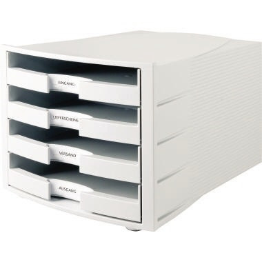Innovatives, attraktives Design in höchster Qualität. Durchgängig geschlossene Böden, auch zur Kleinteile Organisation geeignet. Extra stabiles Gehäuse aus einem Stück gefertigt. · Griffloch vorhanden: Nein · Anzahl der Schubfächer: 4 Schubfächer · Höhe der Schublade: 25 mm · Maße: 29,4 x 23,5 x 36,8 cm (B x H x T) · rutschfest: Ja · Verwendung für Papierformat: DIN A4, DIN C4 · Gehäusefarbe: lichtgrau · stapelbar: Ja · Werkstoff: Polystyrol · Farbe der Schublade: lichtgrau · Beschriftungsschild vorhanden: Ja · Beschriftungsfeld vorhanden: Ja · Auszugsperre vorhanden: Ja · Ausführung des Öffnungszustandes: offen · Format der Schubladen: 4 x breit · Griffmulde vorhanden: Ja