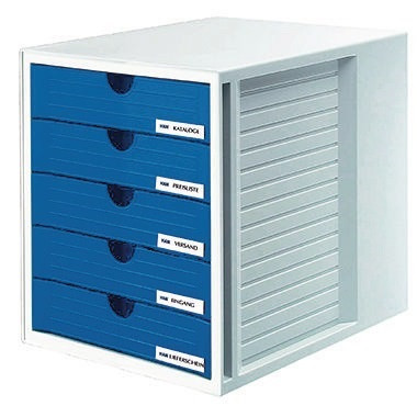 Schübe mit Greifloch und Auslaufsperre sind herausnehmbar. Außenhöhe und -tiefe sind abgestimmt auf Ordnerhöhe bzw. auf ein Ordnerfach im Büroschrank. Rutschfeste, möbelschonende Gummifüße sorgen für einen sicheren Stand. · Verwendung für Papierformat: DIN C4 · Griffmulde vorhanden: Ja · Höhe: 320 mm · Maße: 27,5 x 32 x 33 cm (B x H x T) · rutschfest: Ja · Tiefe: 330 mm · Griffloch vorhanden: Nein · Werkstoff: Polystyrol · stapelbar: Ja · Anzahl der Schubfächer: 5 Schubfächer · Format der Schubladen: 5 x breit · Farbe: blau/lichtgrau · Farbe der Schublade: blau · Breite: 275 mm · Beschriftungsfeld vorhanden: Ja · Auszugsperre vorhanden: Ja · Ausführung des Öffnungszustandes: geschlossen · Ausführung der Lieferzusammenstellung: inkl. Gummifüßchen · Gehäusefarbe: lichtgrau · Höhe der Schublade: 45 mm