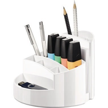 Geschmeidige Formen in hochwertiger Verarbeitung: durchdacht, schwungvoll und dynamisch. Für Stifte und gleichzeitig ein intelligenter Brief- und Kartenschlitz. Standfest und hochglänzend. Möbelschonende Elastikpuffer sind inklusive. Lieferung ohne Deko. · Breite: 140 mm · Tiefe: 140 mm · Maße: 14 x 10,9 x 14 cm (B x H x T) · Farbe: weiß · Anzahl der Fächer: 9 Fächer · Werkstoff: Polystyrol · Höhe: 109 mm
