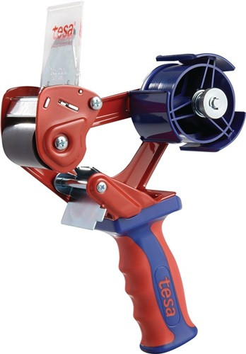 professioneller Handabroller für tesapack® · manuell verstellbare Rollenbremse · verdecktes Messer · weich-gummierter Griff für eine angenehme und sichere Handhabung · Gewicht: 500 g · Rollendurchmesser: 140 mm · Rollenbreite: 50 mm · Rollenkern Ø: 3 Zoll · Weitere technische Eigenschaften Kernloch-Ø: 76mm • Farbe: rot/blau • Material: Metall