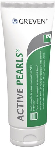 GREVEN® ACTIVE PEARLS® ist ein Handreiniger für starke Verschmutzungen, der hervorragende Reinigungswirkung erzielt, ohne die Haut durch abrasive Reibekörper zu belasten · dank der neuartigen und patentierten Schmutzlösekörper Active Soft Pearls® (ASP) wirkt GREVEN® ACTIVE PEARLS® hocheffektiv auch gegen hartnäckigen Schmutz – und schont dabei die Haut · mit einer sehr wirksamen und milden Tensidmischung aus Acylglutamat sowie mit rückfettenden Glycerinester · Anwendung: auf die trockenen Hände verteilen, Hände mit wenig Wasser waschen, gründlich abspülen und trocknen · Weitere technische Eigenschaften Ausführung: hautschonend • Eigenschaft: Tensidmischung • Gebinde: Tube • Reinigungsbereich: starke Verschmutzung