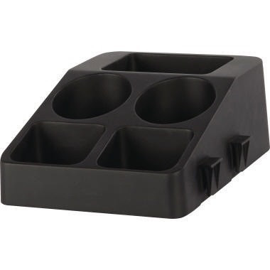 Mit der Helios Service Station halten Sie Ordnung an der Buffettheke. Alles hat seinen Platz und es ist stets aufgeräumt und übersichtlich. Mit insgesamt fünf verschiedenen Einstellmöglichkeiten für beispielsweise Milchbeutel, Zucker, Kaffeebecher oder Teebeutel bietet sie einen perfekten Service rund um die Heißgetränkeversorgung mit Helios Pump-Isolierkannen. Sie können mehrere Service Stationen modular miteinander verbinden bzw. an die baugleiche Halterung des Helios Tropfen-Fängers anschließen. So lassen sich beliebig viele Module aneinander reihen. Das Verbindungssystem ist sehr robust und einfach zu bedienen. · Farbe: schwarz · Maße: 20 x 10 x 27 cm (B x H x T) · Anzahl der Fächer: 5 Fächer · Material: Kunststoff