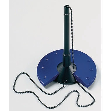 Mit schwarz verchromter Kette, schwarzem Kugelschreiber und schwarzer Mine. Mit rutschfesten Gummifüßen. · Höhe: 155 mm · Werkstoff: Polystyrol · Tiefe: 100 mm · Schreibfarbe: schwarz · rutschfest: Ja · Material der Anbindung: Chrom · Anbindung für Stift vorhanden: Ja · Länge der Anbindung: 56 cm · Farbe: schwarz/blau · dokumentenecht: Nein · Breite: 100 mm · Anzahl der Stifthalterungen: 1 Stifthalterung · Maße: 10,1 x 15 cm (Ø x H)