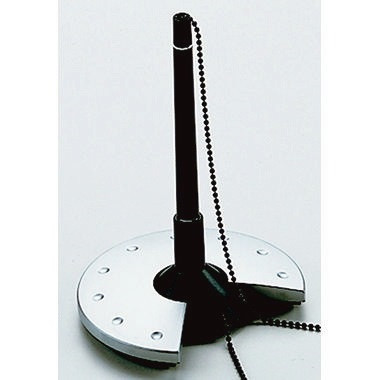 Mit schwarz verchromter Kette, schwarzem Kugelschreiber und schwarzer Mine. Mit rutschfesten Gummifüßen. · Maße: 10,1 x 15 cm (Ø x H) · Tiefe: 100 mm · Werkstoff: Polystyrol · Schreibfarbe: schwarz · rutschfest: Ja · Material der Anbindung: Chrom · Länge der Anbindung: 56 cm · Höhe: 155 mm · Farbe: schwarz/silber · dokumentenecht: Nein · Breite: 100 mm · Anbindung für Stift vorhanden: Ja · Anzahl der Stifthalterungen: 1 Stifthalterung