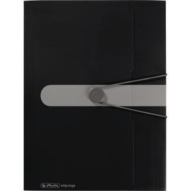 Zum Aufbewahren Ihrer Unterlagen. · Breite: 245 mm · max. Anzahl der Blätter: 300 Bl. (80 g/m²) · Werkstoff: Polypropylen · Verwendung für Papierformat: DIN A4 · Stärke: 0,55 mm · max. Füllhöhe an Papier: 3 mm · 3 Klappen (Jurisklappen) am Unterdeckel vorhanden: Ja · Farbe: opak schwarz · Höhe: 320 mm · Art des Verschlusses: Gummizugverschluss · Maße: 24,5 x 32 cm (B x H)