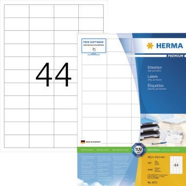 Garantiert staufrei und high-speed-fähig durch extra starken Spezialverbund. Hoher Weißegrad und gleichmäßige Oberfläche für beste Druckergebnisse. Kostenlose Softwarelösungen: www.herma.de/software. · Maße: 48,3 x 25,4 mm (B x H) · wieder ablösbar: Nein · PEFC: Ja · Ausführung des Etikettenträgers: A4-Blatt · selbstklebend: Ja · umlaufender Rand vorhanden: Ja · Werkstoff: Papier · Verwendung für Druck- oder Schreibgerät: Laserdrucker, Farblaserdrucker, Inkjetdrucker, Kopierer · Farbe: weiß · Klebemasse lösungsmittelfrei: Ja · abgerundete Ecken vorhanden: Nein · Anzahl der Blätter je Packung: 100 Bl./Pack. · Anzahl der Etiketten je Blatt: 44 Etik./Bl. · Anzahl der Etiketten je Packung: 4.400 Etik./Pack. · Ausführung des Papiertyps: chlorfrei gebleicht · Grammatur: 70 g/m²