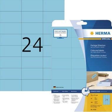Ideal für Kennzeichnungen mit Signalcharakter, z. B. Warnhinweise, Eilvermerke, Adressänderungen, Farbcodierung, Aktionen. Sicher haftend auf allen Oberflächen. Einfach und schnell beschriften mit der kostenlosen Software auf http://www.herma.de/software. · Maße: 70 x 37 mm (B x H) · selbstklebend: Ja · umlaufender Rand vorhanden: Nein · Verwendung für Druck- oder Schreibgerät: Laserdrucker, Farblaserdrucker, Inkjetdrucker, Kopierer · abgerundete Ecken vorhanden: Nein · wieder ablösbar: Ja · Farbe: blau · Werkstoff: Papier · Forest Stewardship Council (FSC): Ja · Ausführung des Papiertyps: chlorfrei gebleicht · Ausführung des Etikettenträgers: A4-Blatt · Anzahl der Etiketten je Packung: 480 Etik./Pack. · Anzahl der Etiketten je Blatt: 24 Etik./Bl. · Anzahl der Blätter je Packung: 20 Bl./Pack. · Klebemasse lösungsmittelfrei: Ja