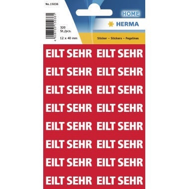 HERMA Hinweisetikett HOME 40 x 12,5 mm (B x H) Papier rot 320 Etik./Pack. · Farbe: rot · umlaufender Rand vorhanden: Nein · Werkstoff: Papier · Text des Aufdruckes: Eilt sehr · Maße: 40 x 12,5 mm (B x H) · Anzahl der Etiketten je Packung: 320 Etik./Pack. · Anzahl der Etiketten je Blatt: 16 Etik./Blatt. · abgerundete Ecken vorhanden: Nein · Anzahl der Blätter je Packung: 20 Bl./Pack. · Farbe des Aufdrucks: weiß