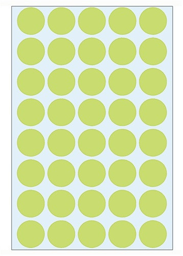Ideal zum Kennzeichnen, Markieren und Organisieren. Farben sorgen für mehr Übersicht. Sicher haftend auf allen Oberflächen. · Forest Stewardship Council (FSC): Ja · selbstklebend: Ja · wieder ablösbar: Nein · Werkstoff: Papier · umlaufender Rand vorhanden: Ja · PEFC: Ja · Klebemasse lösungsmittelfrei: Ja · Höhe des Blattes: 170 mm · Verwendung für Druck- oder Schreibgerät: handschriftlich, Schreibmaschine · Farbe: grün · Anzahl der Etiketten je Packung: 1.280 Etik./Pack. · Ausführung der Haftung: stark haftend · Anzahl der Blätter je Packung: 32 Bl./Pack. · Ausführung des Papiertyps: chlorfrei gebleicht · Beschreibung der Besonderheiten: stark haftend · Breite des Blattes: 111 mm · Durchmesser: 19 mm · Anzahl der Etiketten je Blatt: 40 Etik./Bl.