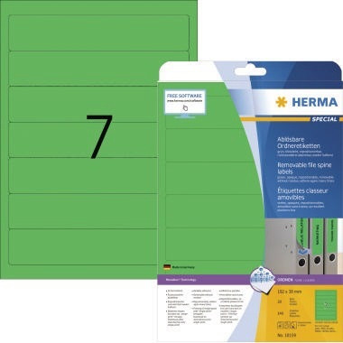 Mit Movables®-Technology: sicher haftend, auch bei häufigem Ordnergebrauch, rückstandsfrei wieder abziehbar ohne den Ordner zu beschädigen, problemlos repositionierbar und mehrfach wieder haftend. Mit hohem Weißgrad, alte Ordnerbeschriftungen scheinen nicht durch. Kostenlose Softwarelösungen: http://www.herma.de/software. · Griffloch vorhanden: Nein · wieder ablösbar: Ja · Verwendung für Druck- oder Schreibgerät: Laserdrucker, Farblaserdrucker, Inkjetdrucker, Kopierer · Verpackung: Karton · umlaufender Rand vorhanden: Ja · selbstklebend: Ja · Maße: 38 x 192 mm (B x H) · Klebemasse lösungsmittelfrei: Ja · Werkstoff: Papier · Forest Stewardship Council (FSC): Ja · Farbe: grün · blickdicht: Ja · Ausführung des Papiertyps: chlorfrei gebleicht · Ausführung des Etikettenträgers: A4-Blatt · Aufdruck vorhanden: Nein · Anzahl der Etiketten je Packung: 140 Etik./Pack. · Anzahl der Blätter je Packung: 20 Bl./Pack. · Format des Schildes: schmal/kurz · Anzahl der Etiketten je Blatt: 7 Etik./Bl.