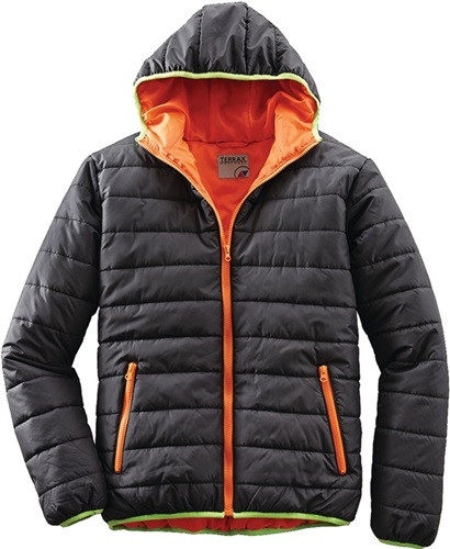 100 % Polyester · angeschnittene Kapuze · kontrastfarbene Reißverschlüsse und Futter