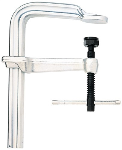schwer · Schiene, Festbügel und Druckplatte in einem Stück aus statisch optimiertem, kaltgezogenem Profilstahl · warmverformt · vergütet und galvanisch verzinkt · Gleitbügel gesenkgeschmiedet · vergütet und galvanisch verzinkt · Trapezgewindespindel vergütet und brüniert mit verzinktem, durchsteckbarem Knebel · lange Lebensdauer dank hitzebeständiger Spezialdruckplatte mit Sinterstahleinlage, schwenkbar bis 35° · mit Sechskant am Spindelende zum Ansetzen eines Schraubenschlüssels · Spannkraft bis 22000 N (2,20 t) bei einen Anzugsdrehmoment von 70 N.m · Weitere technische Eigenschaften Gewicht: 6,67kg