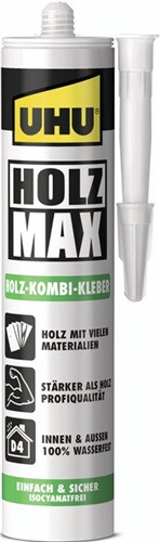 Holz-Kombi-Kleber basierend auf UHU Polymer-Technologie · wasser- und seewasserfest (EN 204: D4) · stärker als Holz · dauerhaft flexibel · isocyanatfrei · UV-beständig · spaltüberbrückend · für die Verklebung von Holz mit Holz und von Holz mit nahezu allen Baumaterialien im Innen- und Außenbereich · entwickelt und getestet von professionellen Handwerkern · Weitere technische Eigenschaften Temperaturbeständigkeit: -40°C bis +120°C • Verbrauch: ca. 200g/m² • Verarbeitungstemperatur: ab +5°C