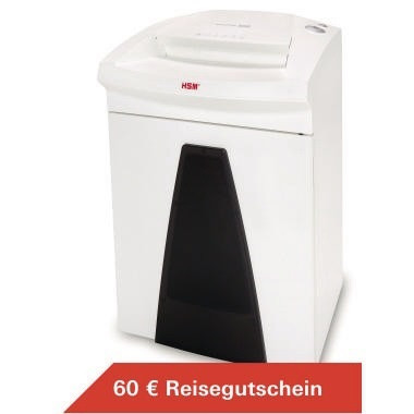 Dieser auf Rollen fahrbare Aktenvernichter sorgt für Datensicherheit am Arbeitsplatz. Seine induktionsgehärteten Vollstahl-Schneidwellen sind unempfindlich gegen Heft- und Büroklammern und garantieren Langlebigkeit. Der kraftvolle Motor stellt eine hohe Schnittleistung sowie zuverlässigen Betrieb auch bei Dauerbelastung sicher. Die optimale Abstimmung aller Schneidwerks- und Antriebskomponenten sowie das geschlossene Getriebe sorgen für hohe Laufruhe. Mit der Multifunktionstaste können Sie das Gerät intuitiv bedienen. Eine integrierte Lichtschranke startet das Gerät automatisch und schaltet es nach Ende der Papierzufuhr wieder ab. Der automatische Rücklauf behebt Papierstau und stellt einen reibungslosen Betrieb sicher. Hohe Anwendersicherheit wird Ihnen durch das aufklappbare Sicherheitselement garantiert, welches einen unbeabsichtigten Einzug verhindert. Sie können den Füllstand des Auffangbehälters durch das Sichtfenster jederzeit einsehen, was rechtzeitiges Entleeren ermöglicht. Der ausziehbare Mehrweg-Auffangbeutel trägt zur einfachen Entsorgung des vernichteten Materials bei. Besonders geringer Stromverbrauch. Die hochwertigen Materialien und die bewährte Qualität Made in Germany garantieren Ihnen Sicherheit und Langlebigkeit. HSM Reiseaktion: Jetzt beim Kauf dieses HSM Aktenvernichter-Aktionsmodells einen Reisegutschein sichern. Alle Informationen zur HSM Reiseaktion finden Sie unter diesem Link: www.hsm.eu/reiseaktion. · max. Anzahl der Blätter (70g/qm) je Schneidearbeitsgang: 24 Bl. (70 g/m²) · Rücklauffunktion vorhanden: Ja · Netzfrequenz: 50 Hz · Netzspannung: 230 V · Rauminhalt für Schnittgut: 55 l · Schnittbreite: 3,9 mm · Schnittgeschwindigkeit: 65 mm/s · Sichtfenster vorhanden: Ja · verwendbares Schnittgut: Papier, Heftklammern, Büroklammern, Kreditkarten, CDs/DVDs · Maße: 49,7 x 67,6 x 39,7 cm (B x H x T) · Zertifikat/Zulassung: Blauer Engel · Tiefe: 397 mm · Bezeichnung der Sicherheitsstufe: P-2, O-2, T-2, E-2 · max. Anzahl der Blätter (80g/qm) je Schneidearbeitsgang: 21 Bl. (80 g/m²) · Masse (Gewicht): 24,2 kg · Art der Betätigung (Schneidwerk): automatisch · automatische Abschaltung vorhanden: Ja · Blauer Engel: Ja · Breite: 497 mm · Eingabebreite für die Materialzuführung: 280 mm · Farbe: lichtgrau · Höhe: 676 mm · Kabel inbegriffen: Ja · Leistungsaufnahme des Motors: 500 W · Art des Schnittes: Streifenschnitt
