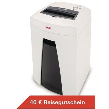 Kompakt, funktionell und komfortabel. Mit Schneidwellen aus gehärtetem Stahl und druckempfindlichem Sicherheitselement. Der leise Aktenvernichter mit herausnehmbarem Auffangbehälter - für anspruchsvolle Anwender im privaten Bereich oder im kleinen Büro. Hochwertige Materialien und Qualität "Made in Germany" für Sicherheit und Langlebigkeit. Schneidwellen aus gehärtetem Stahl. Leiser Betrieb minimiert Geräuschentwicklung am Arbeitsplatz. Papiereinzug mit Überlastungsschutz reduziert Papierstau. Bei Druck auf das Sicherheitselement schaltet das Gerät automatisch ab. Multifunktionstaste für intuitive Bedienung. Herausnehmbarer Auffangbehälter für ein müheloses Entleeren. HSM Reiseaktion: Jetzt beim Kauf dieses HSM Aktenvernichter-Aktionsmodells einen Reisegutschein sichern. Alle Informationen zur HSM Reiseaktion finden Sie unter diesem Link: www.hsm.eu/reiseaktion. · Schnittgeschwindigkeit: 54 mm/s · Oberteil abnehmbar: Nein · Maße: 36,5 x 54,2 x 28 cm (B x H x T) · max. Anzahl der Blätter (70g/qm) je Schneidearbeitsgang: 16 Bl. (70 g/m²) · max. Anzahl der Blätter (80g/qm) je Schneidearbeitsgang: 15 Bl. (80 g/m²) · Netzfrequenz: 50 Hz · Netzspannung: 230 V · Rauminhalt für Schnittgut: 25 l · Rücklauffunktion vorhanden: Ja · Schnittbreite: 3,9 mm · Zertifikat/Zulassung: Blauer Engel · Sichtfenster vorhanden: Ja · verwendbares Schnittgut: Papier, Heftklammern, Büroklammern, Kreditkarten · Masse (Gewicht): 9,8 kg · Art des Schnittes: Streifenschnitt · Tiefe: 280 mm · Art der Betätigung (Schneidwerk): automatisch · automatische Abschaltung vorhanden: Ja · Bezeichnung der Sicherheitsstufe: P-2, T-2, E-2 · Blauer Engel: Ja · Breite: 365 mm · Eco-Modus vorhanden: Ja · Eingabebreite für die Materialzuführung: 230 mm · Farbe: weiß · Garantie gewährt: Ja · Garantiedauer: 3 Jahre · Höhe: 542 mm · Kabel inbegriffen: Ja · Ein-/Ausschalter vorhanden: Ja · Leistungsaufnahme des Motors: 360 W