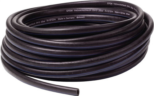 Made in Germany Festigkeitsträger: Textileinlagen gewendelt Decke: EPDM schwarz, glatt extrudiert, ozon- und witterungsbeständig Seele: EPDM schwarz mit guter Chemikalienbeständigkeit Temperaturbereich: -40 bis 100 °C Elektrischer Widerstand: R Einsatzmöglichkeiten: Durchleitung von heißem und kaltem Wasser, Luft und anderen Medien, einsetzbar in Industrie, Land- und Bauwirtschaft