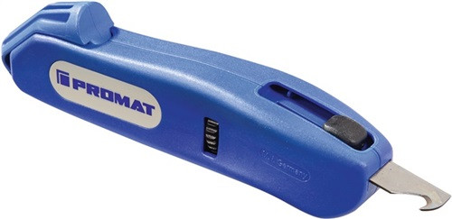 aus hochfestem, glasfaserverstärktem Kunststoff · stufenlos regulierbar · leicht bedienbare Stellschraube · Klinge ist in beiden Positionen drehbar · präzises, schnelles und sicheres Entmanteln Sicherheit durch einfahrbare Hakenklinge · Weitere technische Eigenschaften Gewicht: 72kg • Griff: Kunststoff