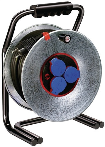 Trommelkörper aus Stahlblech, rostgeschützt verzinkt, auf besonders stabilem Tragegestell · mit Drehgriff für komfortables Aufrollen · 3 Schutzkontakt-Steckdosen, spritzwassergeschützt, mit selbstschließenden Deckeln  Duo-Sicherheits-System: Überhitzungsschutz und Unfallschutzautomatik mit Kontroll-Leuchte · Besondere Produktvorteile: mit Drehkontakt-Komfort, d.h. problemloses Abrollen mit angeschlossenen Elektrogeräten  Gummikabel  H07RN-F  · zum ständigen Einsatz im Freien ·  Weitere technische Eigenschaften Kabelfarbe: schwarz