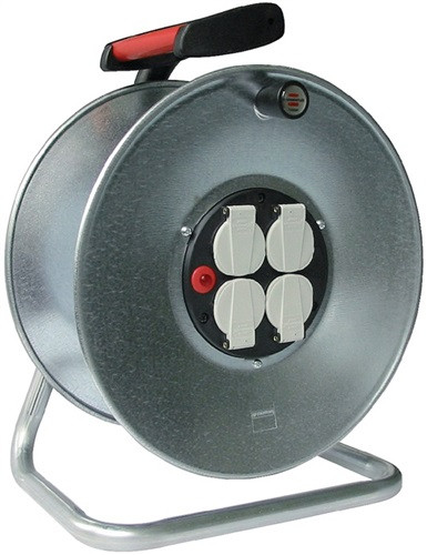 Trommelkörper aus verzinktem Stahlblech auf besonders stabilem Tragegestell · 4 Schutzkontaktsteckdosen 230 V mit selbstschließenden Klappdeckeln · mit Überhitzungsschutz und Kontrollleuchte · Schutzart IP44  Lieferung ohne Kabel