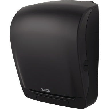 Ein Spender, passend für verschiedene Papierhandtuchqualitäten. Freie Wahl bei der Nutzung der Schließfunktion (mit oder ohne Schlüssel). Das Einlegen einer Papierrolle in den Spender erfolgt durch einfaches Hineinlegen in die vorgesehene Halterung. Anschließend das Papier bis zur markierten Linie ziehen (Paper until here) und den Deckel schließen. Einfach auf 'Push' drücken und das Papier kommt automatisch heraus. Der vollständig zu öffnende Schneidemechanismus ist leicht zugänglich. Dank der transparenten Seitenwände lässt sich der Papierverbrauch ganz leicht kontrollieren. · Farbe: schwarz · Maße: 33,5 x 40,3 x 21,6 cm (B x H x T) · Verwendung für Produkt: Rollenhandtücher · Verwendung für Rollenbreite: 190 mm · Werkstoff: Kunststoff · abschließbar möglich: Ja