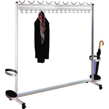 Reihengarderobe mit hoher Kapazität. In 3 Breiten erhältlich. Optionales Zubehör: Schirmhalter mit integrierter Tropfmulde, welchen man wahlweise rechts und/oder links anbringen kann. Typische Objektgarderobe auch mit Garderobenmarken ausstattbar. · Anzahl der Haken: 86 Haken · Farbe: alusilber · Maße: 180 x 170 x 40 cm (B x H x T) · Werkstoff: Aluminium