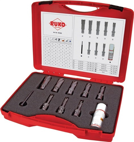 mit Hartmetallschneiden und Quick IN-Schaft · CBN-geschliffen Inhalt: 8 Stck. Kernbohrer mit HM-Schneiden Ø 12, 14, 16, 18, 20, 22, 24, 26 mm 1 Schneidspray 50 ml 1 Führungsstift Ø 6,35 x 87 mm für Schnitttiefe 50 mm im Kunststoffkoffer · Weitere technische Eigenschaften Inhalt: 10 teilig • Schaftausführung: Quick IN • Schnitttiefe: 50mm