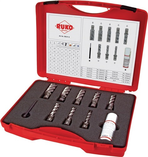 mit Quick IN-Schaft · CBN-geschliffen Inhalt: 8 Stck. Kernbohrer HSS-Co 5 ComPact Ø 12, 14, 16, 18, 20, 22, 24, 26 mm 1 Schneidspray 50 ml 1 Führungsstift Ø 6,35 x 87 mm für Schnitttiefe 50 mm im Kunststoffkoffer · Weitere technische Eigenschaften Inhalt: 10 teilig • Schaftausführung: Quick IN • Schnitttiefe: 50mm
