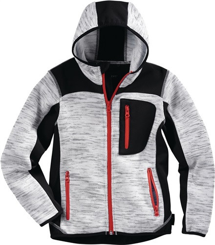 Strickmaterial: 100 % Polyester · Softshellmaterial: 94 % Polyester, 6 % Elastan · angenehme und elastische Kinder-Strickjacke · mit Softshelleinsätzen und flauschiger, wärmender Innenseite · wasserabweisend, atmungsaktiv (800 mvp), winddicht · optimale Kinder-Passform, Marken-Frontzipper · Kinnschutz, Windschutzleiste, feste Kapuze · verlängerter Rücken · Ärmelabschluss mit Einfassband · 2 Seitentaschen mit Reißverschluss · Innentasche, Handytasche, Brusttasche