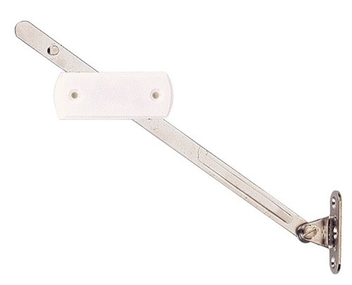 zum Anschrauben · in geöffnetem Zustand ist die Klappe arretiert · Stützstange, Lager und Fuß: Stahl vernickelt · Gehäuse: Kunststoff weiß · Klappe muss oben mit Topfscharnieren angeschlagen werden! · Weitere technische Eigenschaften Oberfläche: vernickelt • Öffnungswinkel: 90°