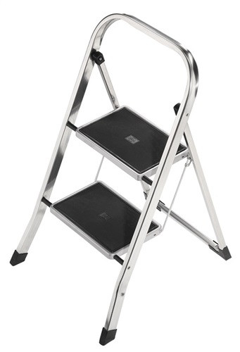 zusammengeklappt nur 50 mm schmal · stabile Aluminium-Holme · Stahl-Stufen silbergrau-beschichtet, mit schwarzem Anti-Rutsch-Belag · breite Stufen für hohen Standkomfort · Sicherheitsverriegelung · max. Gesamtbelastung 150 kg · geringes Gewicht · Weitere technische Eigenschaften Tiefe geklappt: 50mm • Höhe geklappt: 900mm • Breite geklappt: 470mm