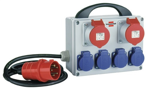 stabiles, schlagfestes Kunststoffgehäuse · mit CEE 16 A Stecker · 2 CEE-Steckdosen 400 V 16 A · 4 Schutzkontaktsteckdosen 230 V / 16 A · alle Steckdosen sind mit selbstschließenden Spritzwasserschutzdeckeln ausgerüstet · Zuleitung H07 RN-F 5 x 1,5 mm², ca. 2 m lang · · zur Verwendung im Innen- und Außenbereich zugelassen